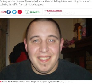 亡くなったのはイリノイ州ピオリア出身の3児の父スティーヴン・ディークスさん(Steven Dierkes、39)で、工場の最も大きな溶解炉の近くで鉄のサンプルを採取していた。