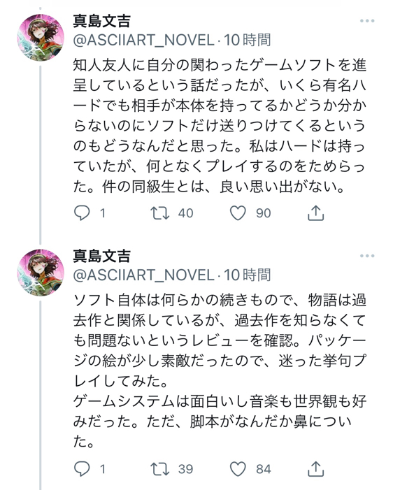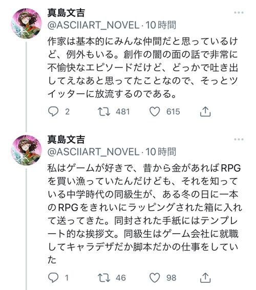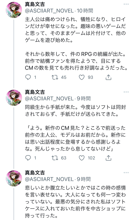 【悲報】ライトノベル作家、中学時代の同級生にとんでもないことをされてしまう・・・ Twitter Facebook はてブ LINE コピー 2022.06.13 スポンサーリンク 1: それでも動く名無し 2022/06/13(月) 00:56:15.69 ID:dJ7sdhU0d これはあかんやろ・・・ https://twitter.com/ASCIIART_NOVEL/status/1535815192587948032 4: それでも動く名無し 2022/06/13(月) 01:00:55.04 ID:eFCB8tlw0 最高の煽り文句やん草生える 9: それでも動く名無し 2022/06/13(月) 01:05:59.83 ID:/9PICBaY0 何のゲームなんや 続きを読む