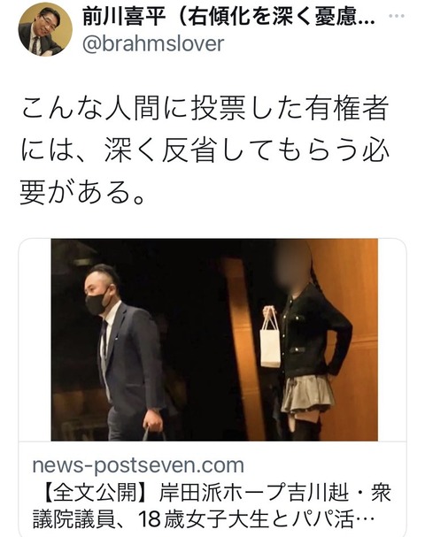 【全文公開】岸田派ホープ吉川赳・衆議院議員、18歳女子大生とパパ活飲酒 「俺、18歳に興味あるわ」「胸を見せて」高級ホテルで何があったのか