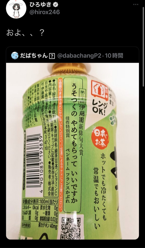 【速報】ひろゆき名言、伊藤園に採用されてしまうwwww (※画像あり) Twitter Facebook はてブ LINE コピー 2022.06.14 スポンサーリンク 1:以下、?ちゃんねるからVIPがお送りします:2022/06/13(月) 23:20:52 2:以下、?ちゃんねるからVIPがお送りします:2022/06/13(月) 23:21:27 ひろゆきやん 3:以下、?ちゃんねるからVIPがお送りします:2022/06/13(月) 23:21:43 ペンネームw 4:以下、?ちゃんねるからVIPがお送りします:2022/06/13(月) 23:21:54 伊藤園め新しい売り方かんがえやがったなw 続きを読む
