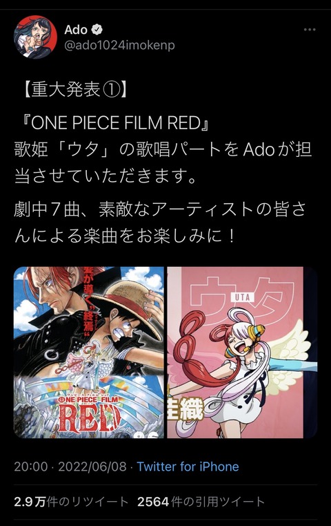尾田っち「んほぉ~Adoちゃんの歌声たまんねぇ~映画に起用したろ!」シコシコ (※画像あり)